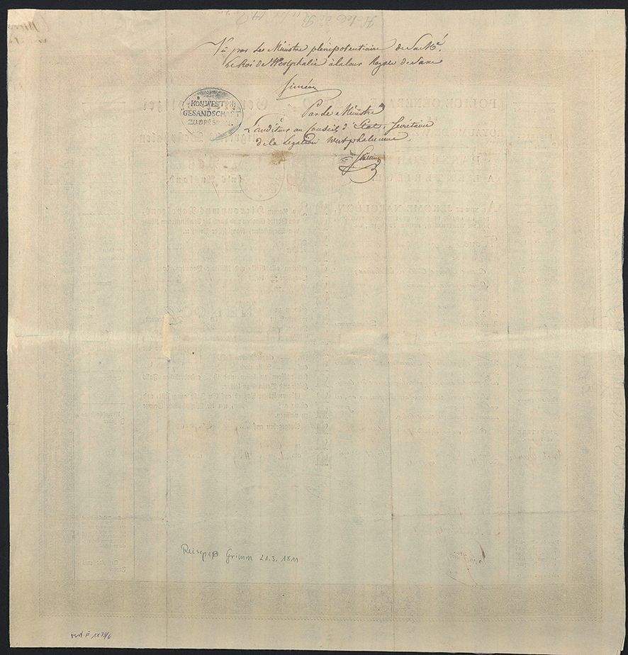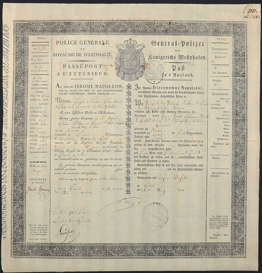 Auffallend an dem für Jacob Grimm ausgefertigten Reisedokument ist die zweisprachige Gestaltung des Formulars in Deutsch und Französisch. Kassel, damals Hauptstadt des Königreichs Westphalen, stand unter der Regentschaft von Napoleons Bruder Jérôme Bonaparte, in dessen Namen auch der hier abgebildete Reisepass ausgestellt wurde. Französisch war somit in vielen Verwaltungsangelegenheiten verpflichtend und fungierte darüber hinaus als europäische Diplomatie- und Bürokratiesprache während der napoleonischen Ära.