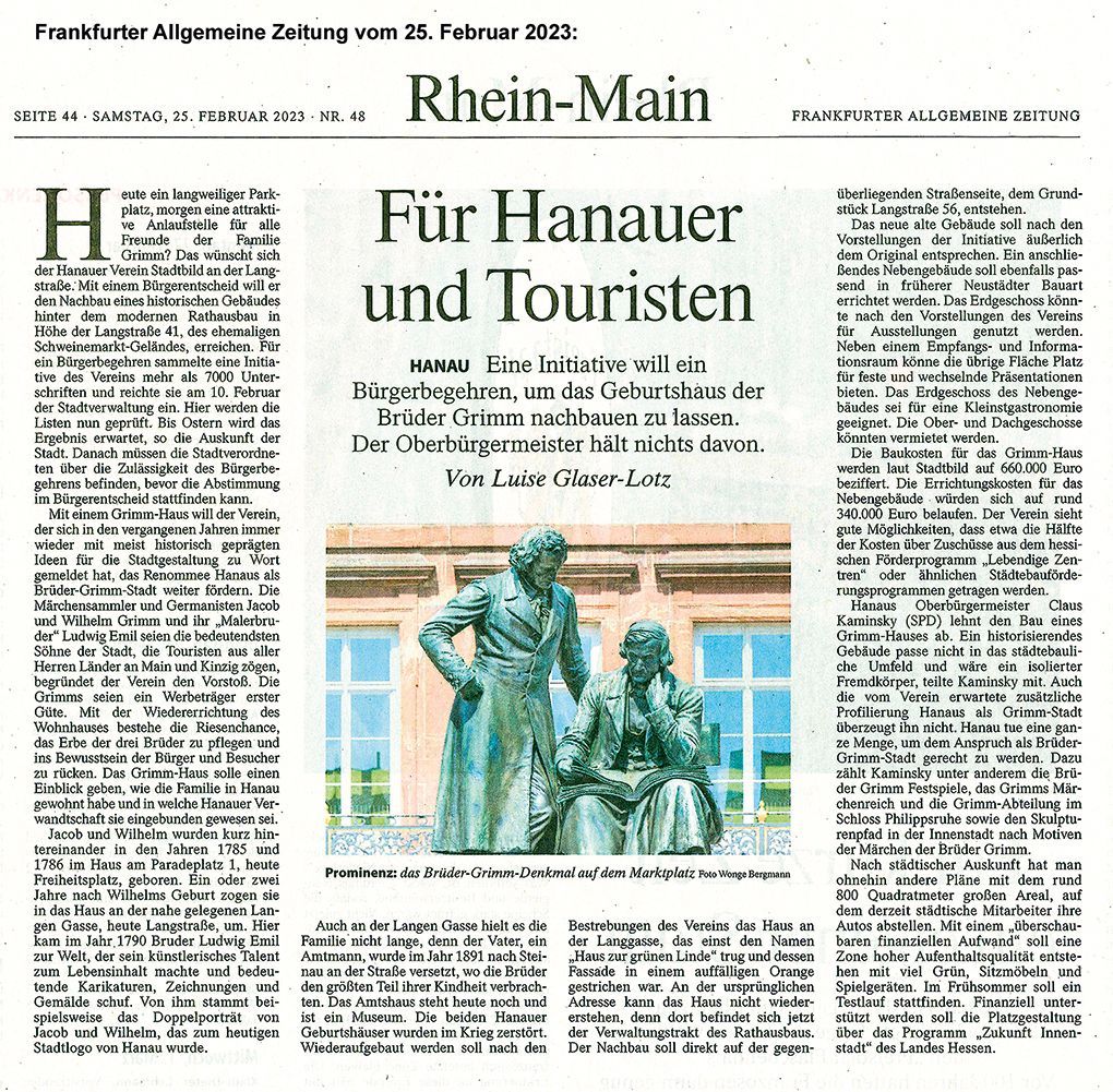 Der Grimmhaus Hanau e.V. spricht sich in der vom Bundespräsidenten angeregten Debatte um hervorzuhebende Orte mit Bezug zur Demokratiegeschichte für die Einbeziehung des wieder zu errichtenden Wohnhauses der Familie Grimm an der Langstraße aus. Hühn: „Das Grimmhaus ist als